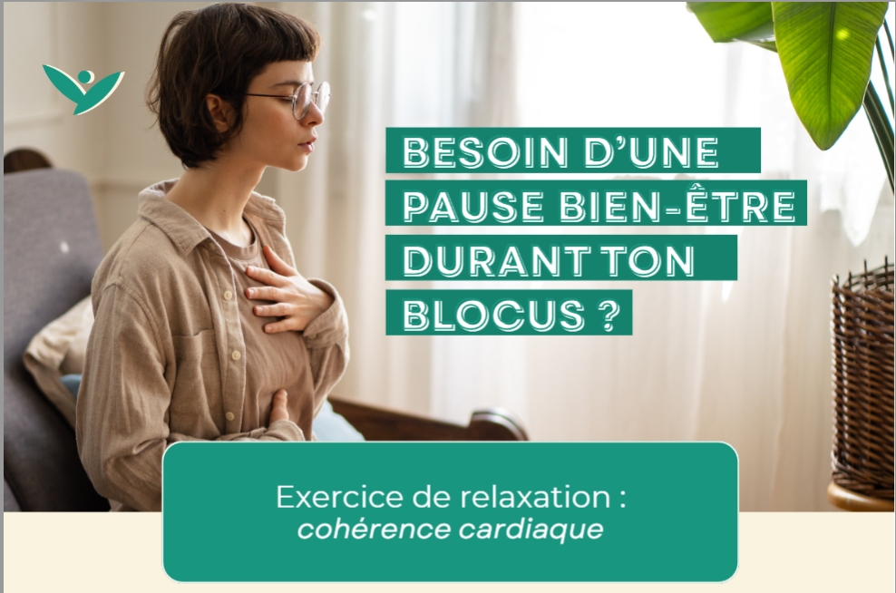 | Cohérence cardiaque (3-6-5) - Pause bien-être en blocus Testez chaque semaine un exercice de gestion du stress pour vous aider à traverser la période des examens. | |