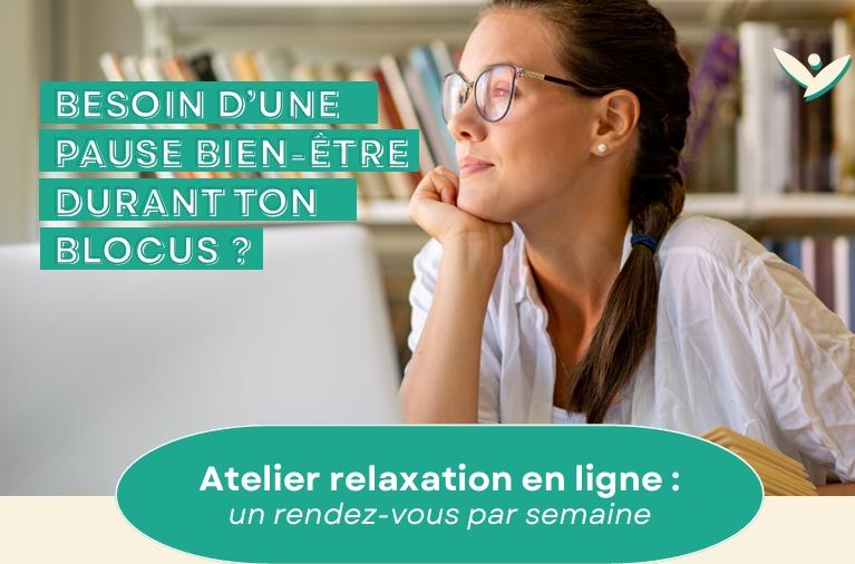 | Ateliers relaxation en ligne - 1h par semaine pendant le blocus printemps 2026 Les ateliers de relaxation sur teams reviennent en mai et juin. Un petit rendez-vous bien-être de 1h facile à placer dans votre agenda malgré le blocus ! | |