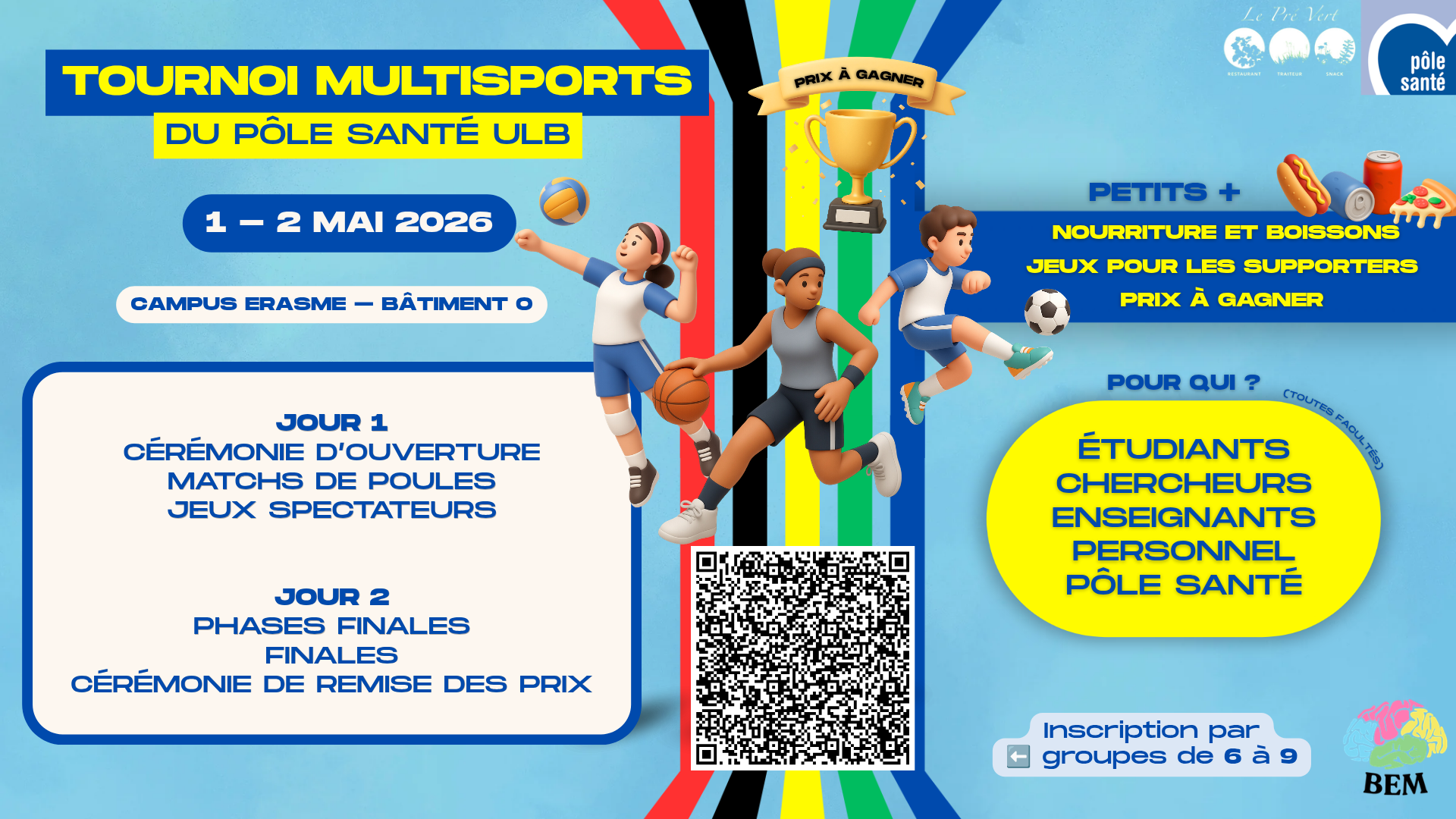 | Tournoi multisport du Pôle Santé Le Bureau étudiant de la Faculté de Médecine (BEM) organise un tournoi sportif les 1er et 2 mai prochains, de 9h00 à 18h00, sur le campus Erasme, au bâtiment O (salle de sport). Cet événement s’adresse à l’ensemble de la communauté du Pôle Santé et vise à promouvoir l’activité physique, la cohésion et les rencontres interprofessionnelles dans un cadre convivial. | |