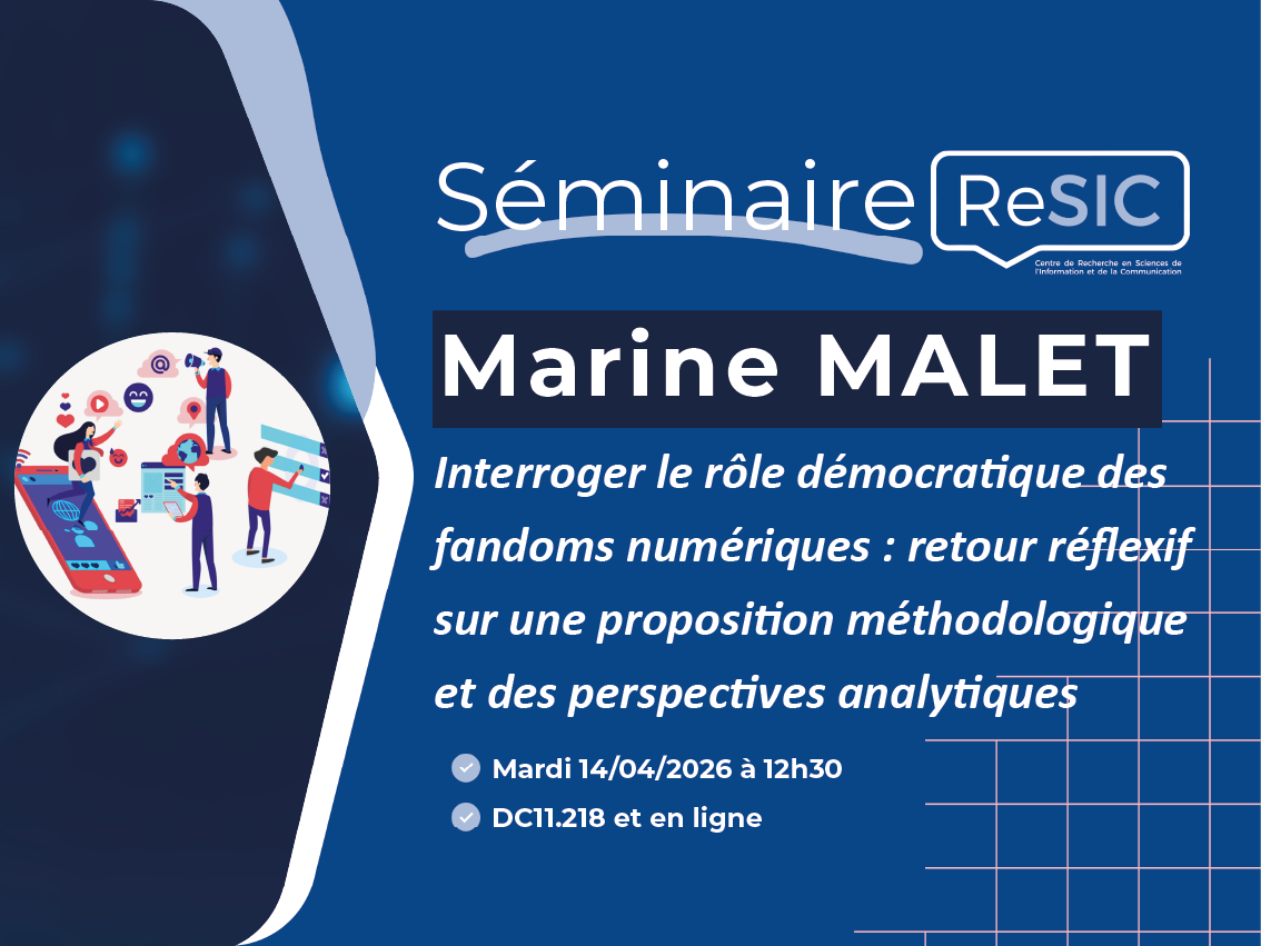 | Séminaire ReSIC 2025-26 -Marine Malet Interroger le rôle démocratique des fandoms numériques : retour réflexif sur une proposition méthodologique et des perspectives analytiques | |