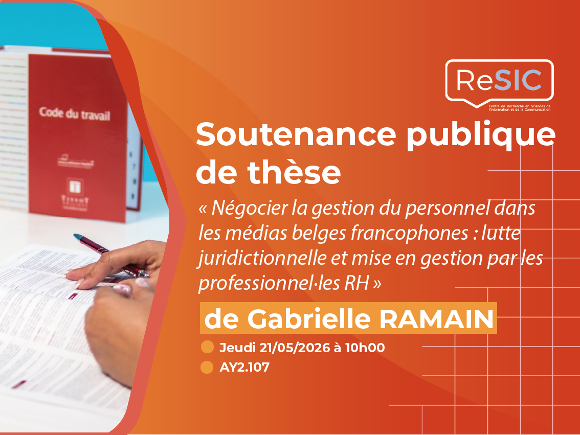 | Soutenance de thèse publique de Gabrielle RAMAIN « Négocier la gestion du personnel dans les médias belges francophones : lutte juridictionnelle et mise en gestion par les professionnel·les RH » | |