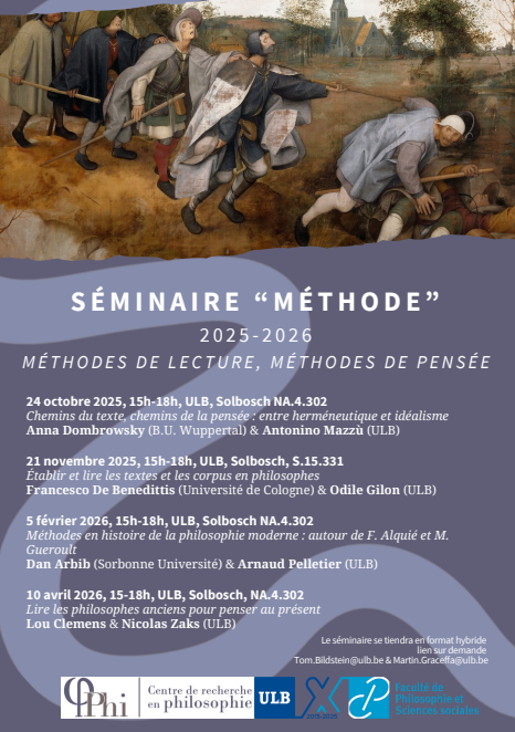 - Jeudi 5 février 2026, 15h-18h, ULB, Solbosch NA.4.302 Méthodes en histoire de la philosophie moderne : autour de F. Alquié et M. Gueroult Dan Arbib (Sorbonne Université) & Arnaud Pelletier (ULB)