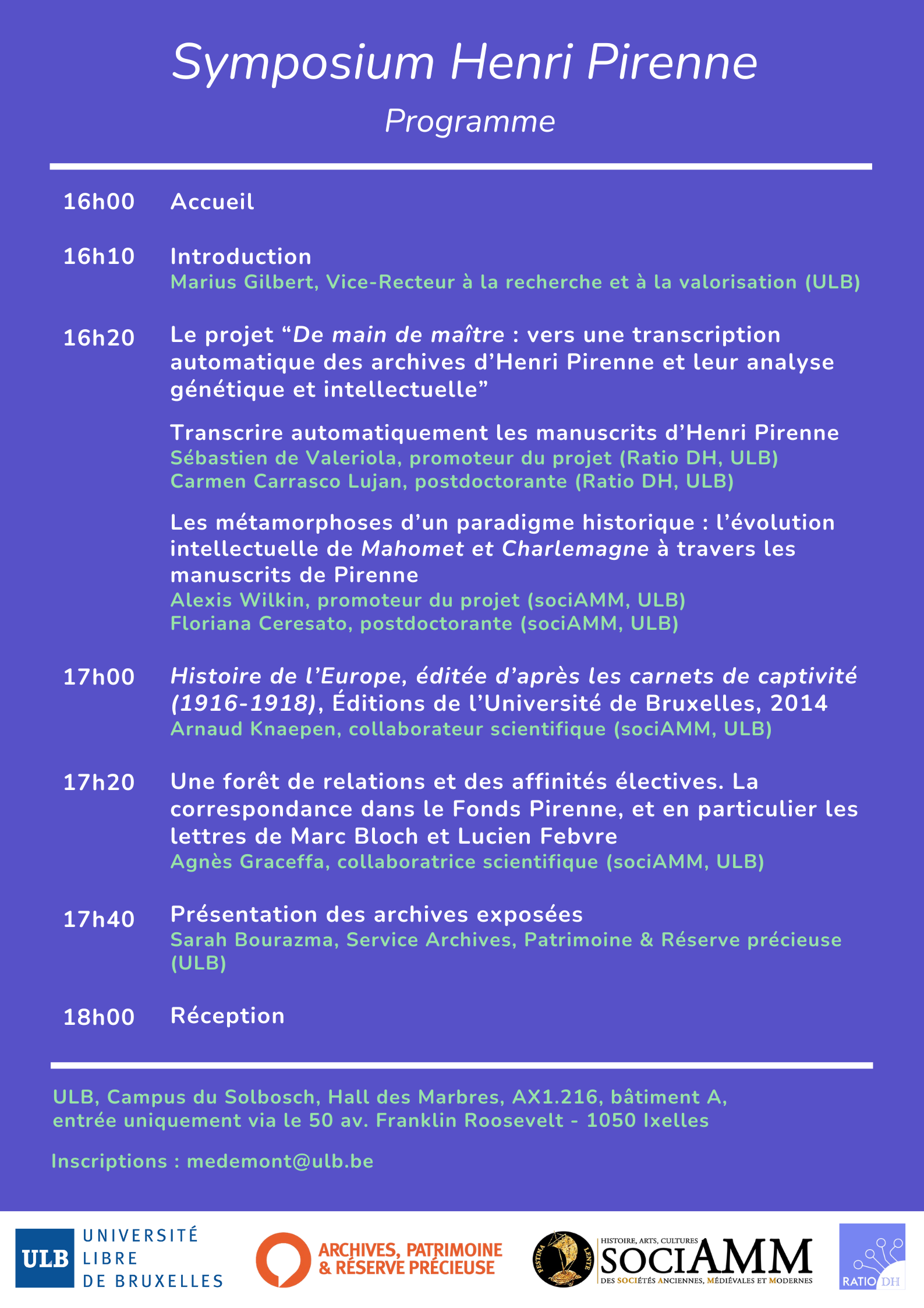 Organisé à l’occasion du 40ᵉ anniversaire de la constitution de ce fonds d’archives exceptionnel, cet événement s’inscrit dans le cadre du projet de recherche « De main de maître : vers une transcription automatique des archives de l’historien Henri Pirenne et leur analyse génétique et intellectuelle », dirigé par Sébastien de Valeriola (Ratio DH) et Alexis Wilkin (sociAMM).