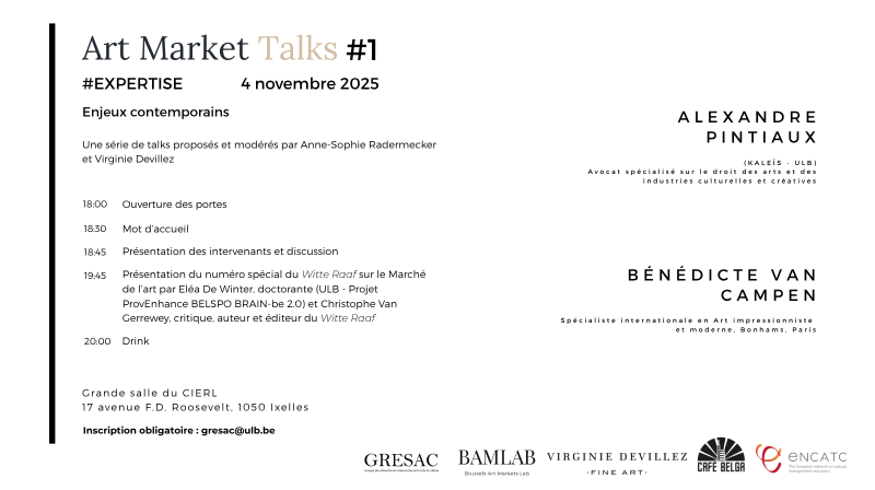 Ce premier talk propose d’explorer ces thématiques à travers l’expérience de Bénédicte Van Campen, spécialiste en art impressionniste et moderne chez Bonham’s, et le regard juridique d’Alexandre Pintiaux, avocat spécialisé en droit des arts, afin de comprendre comment expertise, droit et marché doivent désormais s’articuler face à ces enjeux.