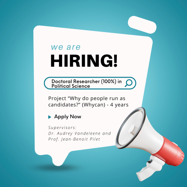 The Department of Political Science at the Université libre de Bruxelles (ULB) is hiring a doctoral researcher with a specialization in qualitative research (in depth interviews) and interest in quantitative research for the project “Why do people run as candidates?” (Whycan) funded via research project (PDR) from the FRS-FNRS (2025-2028).