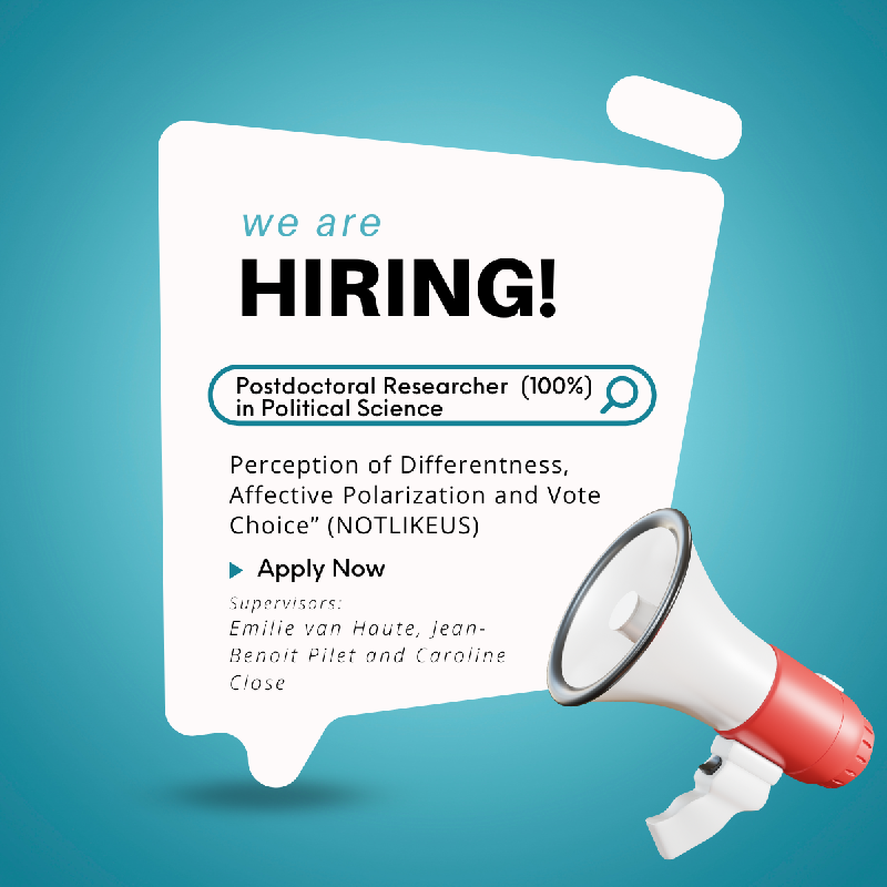 The Department of Political Science at the Université libre de Bruxelles (ULB) is hiring a post-doctoral researcher with a specialization in quantitative data analysis for the project “Perception of Differentness, Affective Polarization and Vote Choice” (NOTLIKEUS) funded via an Excellence of Science (EoS) programme from the FRS-FNRS and the FWO.