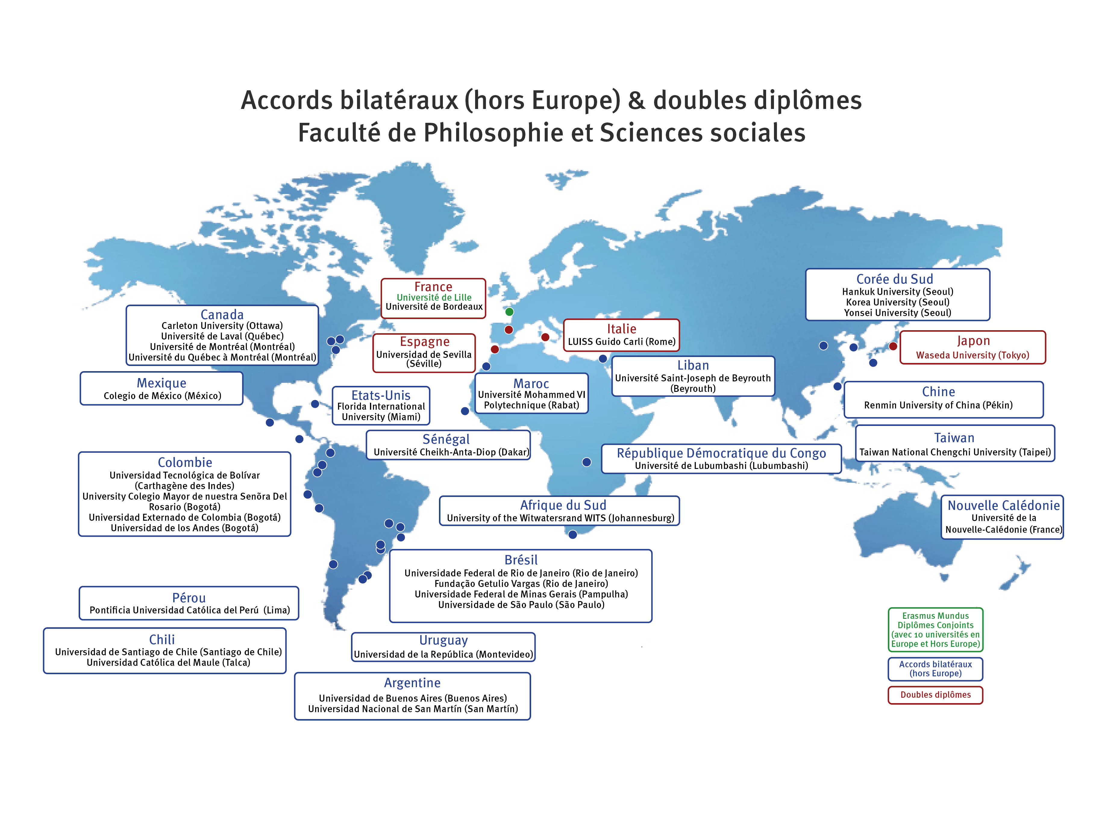 Les échanges avec ces partenaires peuvent prendre la forme d’accords Erasmus pour les destinations européennes. Les liens tissés avec les partenaires hors-Europe ont été concrétisés par des conventions inter-universitaires ou inter-facultaires selon les destinations. Dans certaines filières spécifiques telle que l’anthropologie, la Faculté s’insère dans des structures en réseau.